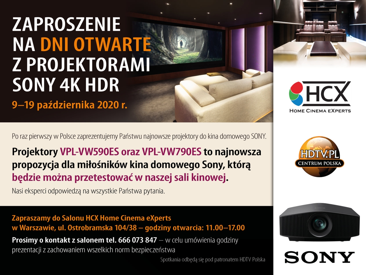 Dzięki uprzejmości firmy Sony Professional Europe i przy wsparciu HDTVPolska mamy przyjemność podsumować ciekawe wydarzenie, które miało miejsce w naszej sali kinowej - od 9 do 19 Października 2020 roku. Jako jedni z pierwszych w Polsce będziemy mogli zaprezentować najnowsze projektory kina domowego - VPL-VW590ES oraz VPL-VW790ES w naszej sali kinowej. Zaczynamy 9 października i przez cały tydzień zachęcamy do zapisów pod numerem telefonicznym – 666 073 847. Jednocześnie chcielibyśmy poinformować, że oprócz obecnie trwającego wydarzenia, zdecydowaliśmy się uczynić październik miesiącem z projektorami Sony. Dla każdej osoby, która złoży zamówienie i wpłaci zaliczkę, możemy przygotować atrakcyjną cenę. Wśród projektorów, które mają obniżone ceny w naszym salonie znajdziecie: VPL-VW570ES/W, VPL-VW590ES/W, VPL-VW590ES/B oraz VPL-VW790ES.