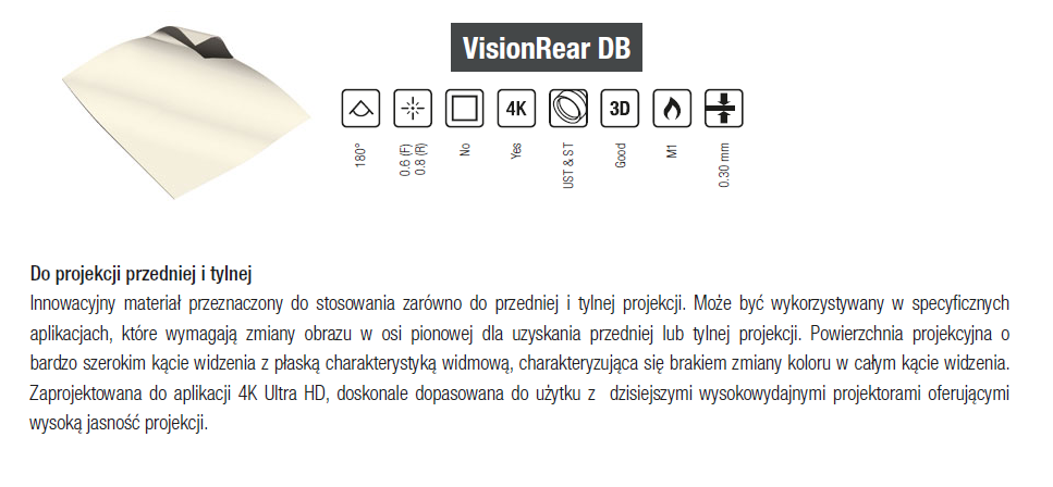 - Powierzchnie projekcyjne: VisionWhite, VisionWhitePro, ReferenceWhite 2, ReferenceGrey 2, Ambient Grey 2, VisionAcoustik, VisionRear DB, VisionRear tylko w wersji bez czarnych ramek