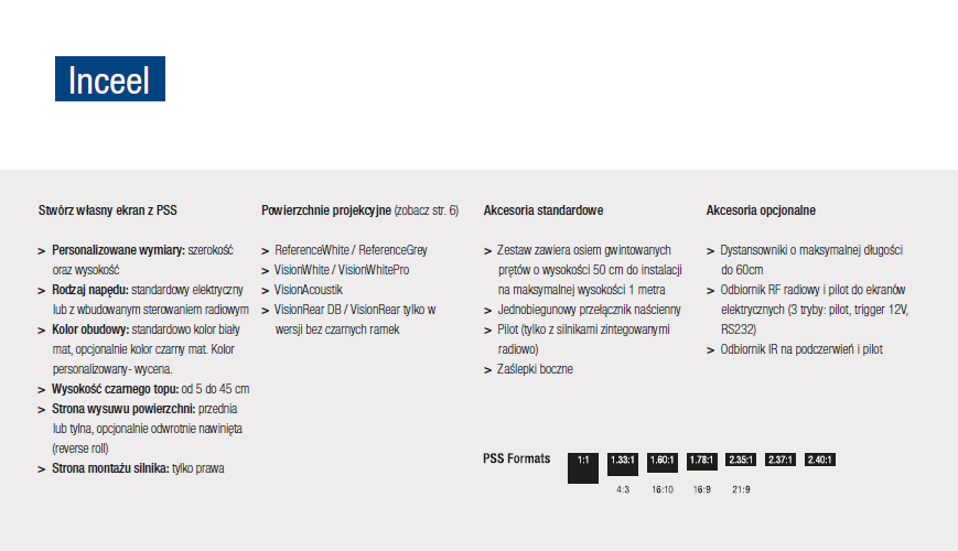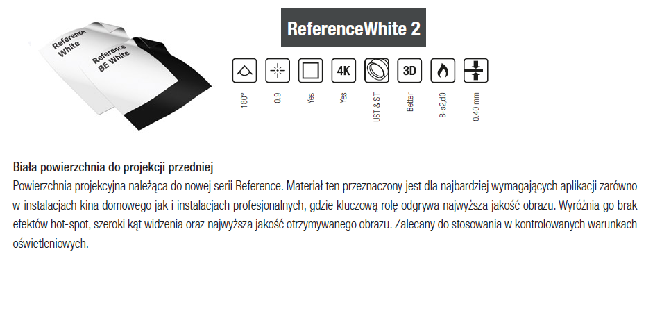 - Powierzchnie projekcyjne: VisionWhite, VisionWhitePro, ReferenceWhite 2, ReferenceGrey 2, Ambient Grey 2, VisionAcoustik, VisionRear DB, VisionRear tylko w wersji bez czarnych ramek