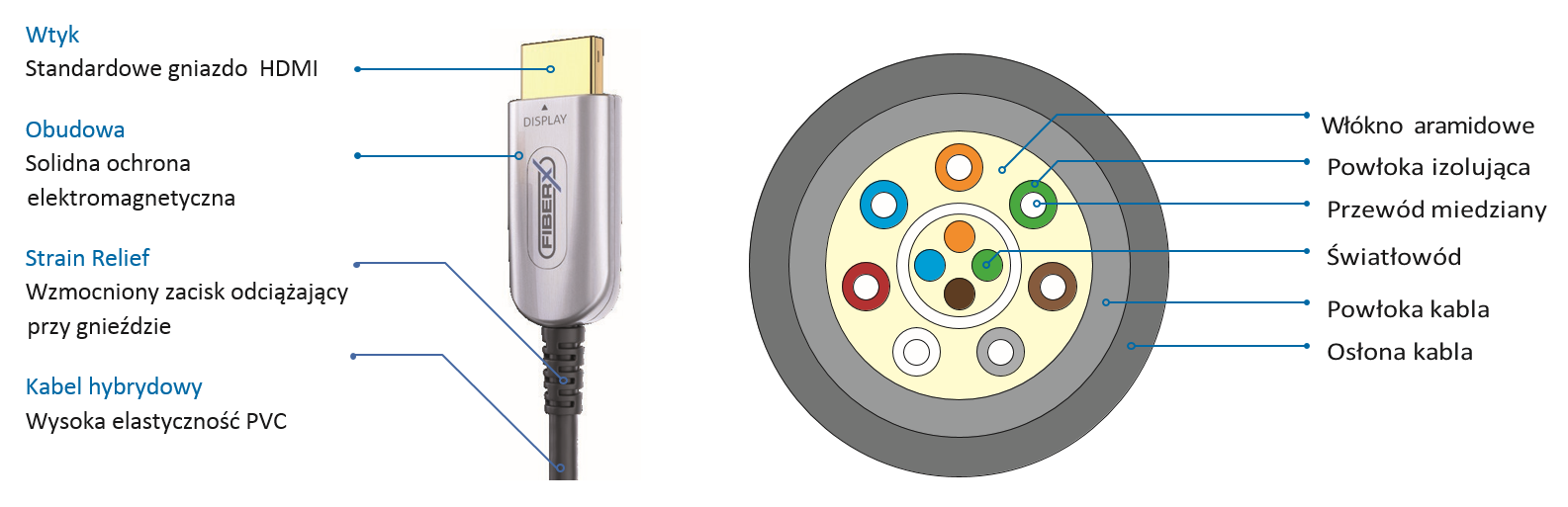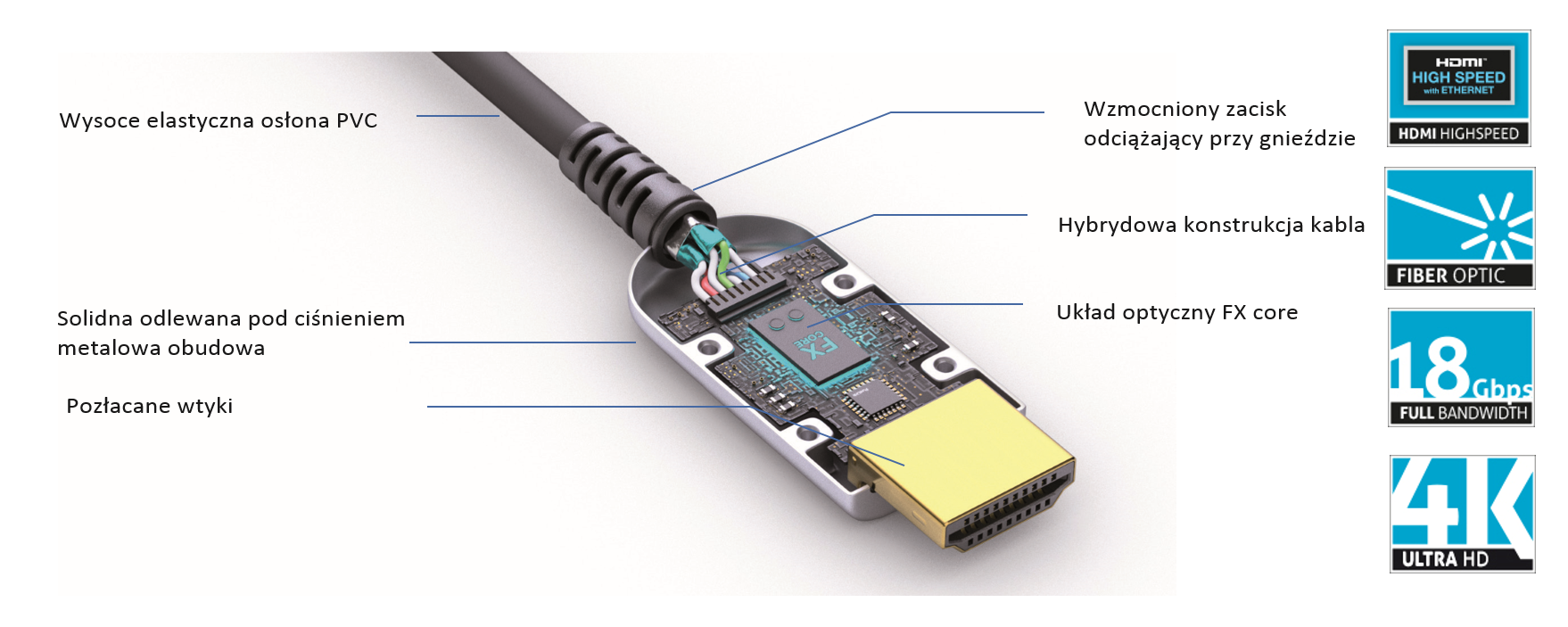 - Aktywna światłowodowa transmisja sygnału w pełnej szerokości pasma 18 Gbps