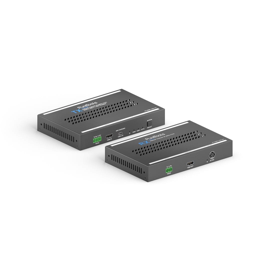 Para wzmacniaczy PureTools HDBaseT z wejściem HDMI i USB-C — 10,2 Gb/s, (4K 60 Hz 4:2:0), HDCP 2.2, przez HDBaseT, wejście wideo HDMI i USB-C z ładowaniem 60 W, PoE z RX do TX, RS232 pass-through i automatyczne przełączanie, 4K@40m i 1080p@70m