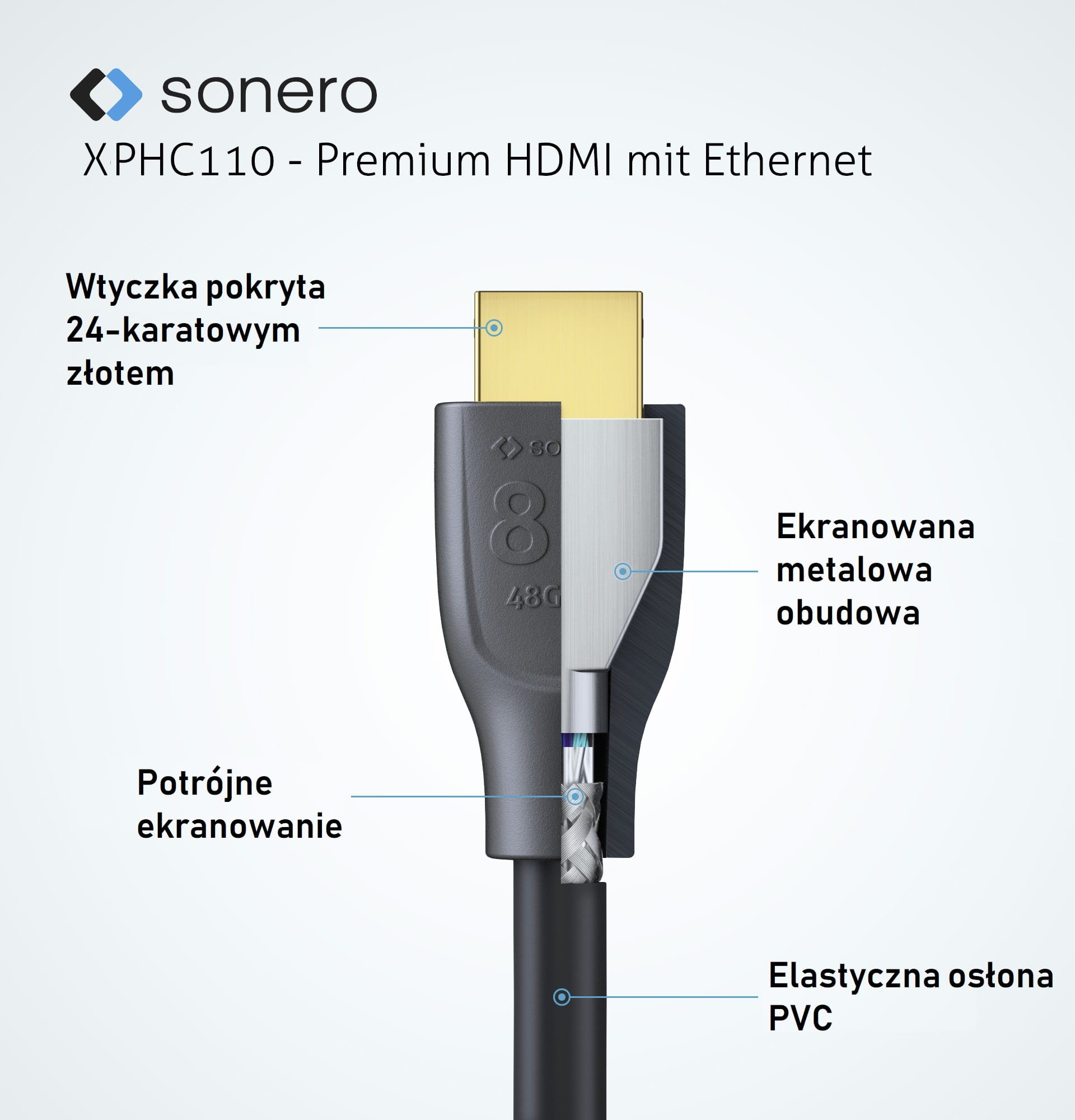 Seria Sonero XPHC110 obsługuje pełną pasmo 48Gb/s zapewniając rozdzielczość 8K@60Hz oraz 4K@120Hz (120 klatek na sekundę) przy pełnym spektrum kolorów i kontrastu. Bezstratna transmisja zgodna z najnowszym standardem HDMI 2.1 jest możliwa dzięki trzykrotnemu ekranowaniu, złoconym stykom i zastosowaniu wysokiej jakości miedzi OFC jako wewnętrznych przewodników. Obudowa wtyczki zbudowana jest z metalu zapewniając niezwykła trwałość. Cechą charakterystyczną jest mały promień skrętu. Ekranowana, w pełni metalowa obudowa z 24-karatowym złotem złączami zapewnia najlepszą dostępną jakość transmisji sygnału.