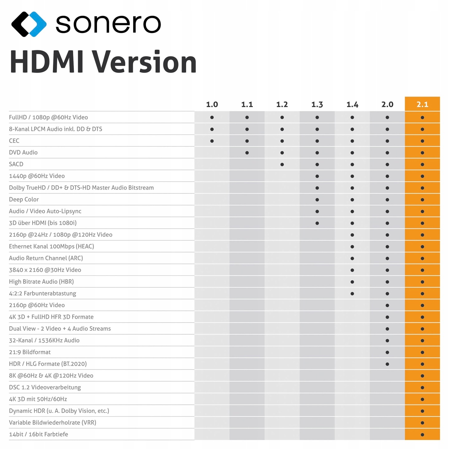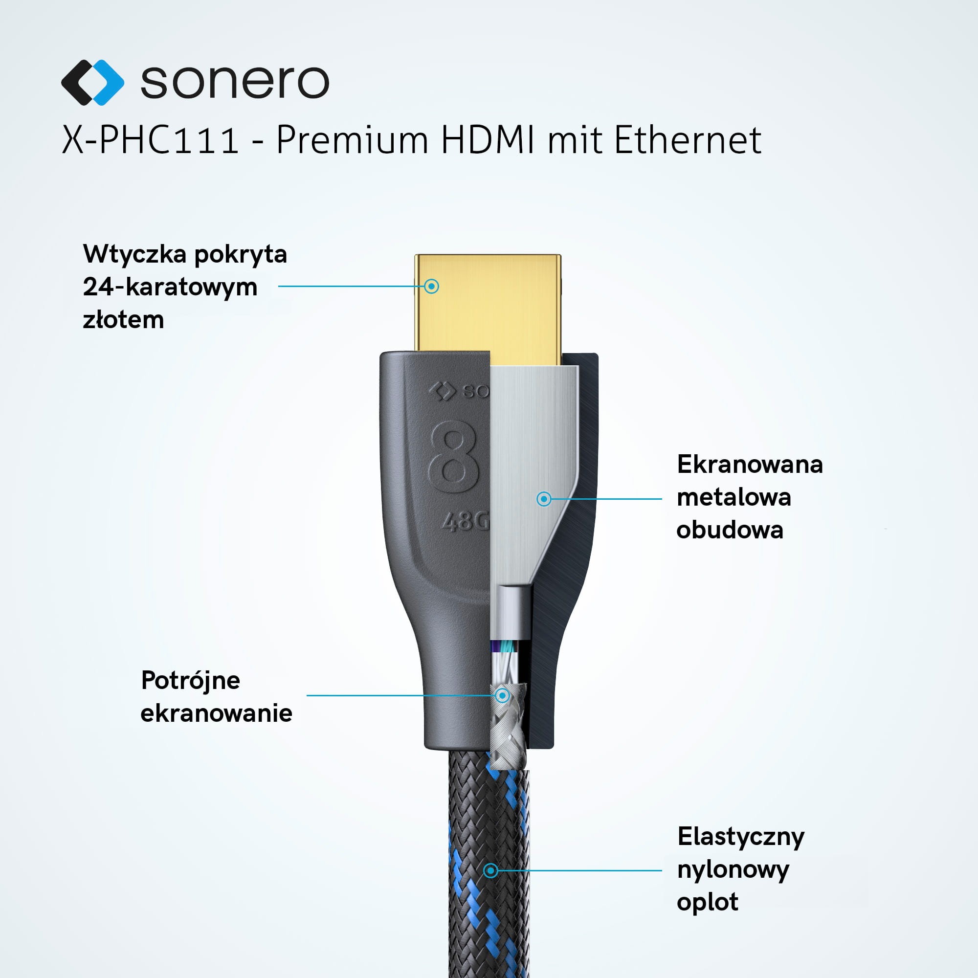Seria Sonero XPHC111 obsługuje pełną pasmo 48Gb/s przy długości 2 metrów (wkrótce 3 i 5metrów) zapewniając rozdzielczość 8K@60Hz oraz 4K@120Hz (120 klatek na sekundę) przy pełnym spektrum kolorów i kontrastu. Bezstratna transmisja zgodna z najnowszym standardem HDMI 2.1 jest możliwa dzięki trzykrotnemu ekranowaniu, złoconym stykom i zastosowaniu wysokiej jakości miedzi OFC jako wewnętrznych przewodników. Obudowa wtyczki zbudowana jest z metalu zapewniając niezwykła trwałość. Cechą charakterystyczną jest mały promień skrętu. Ekranowana, w pełni metalowa obudowa z 24-karatowym złotem złączami zapewnia najlepszą dostępną jakość transmisji sygnału.